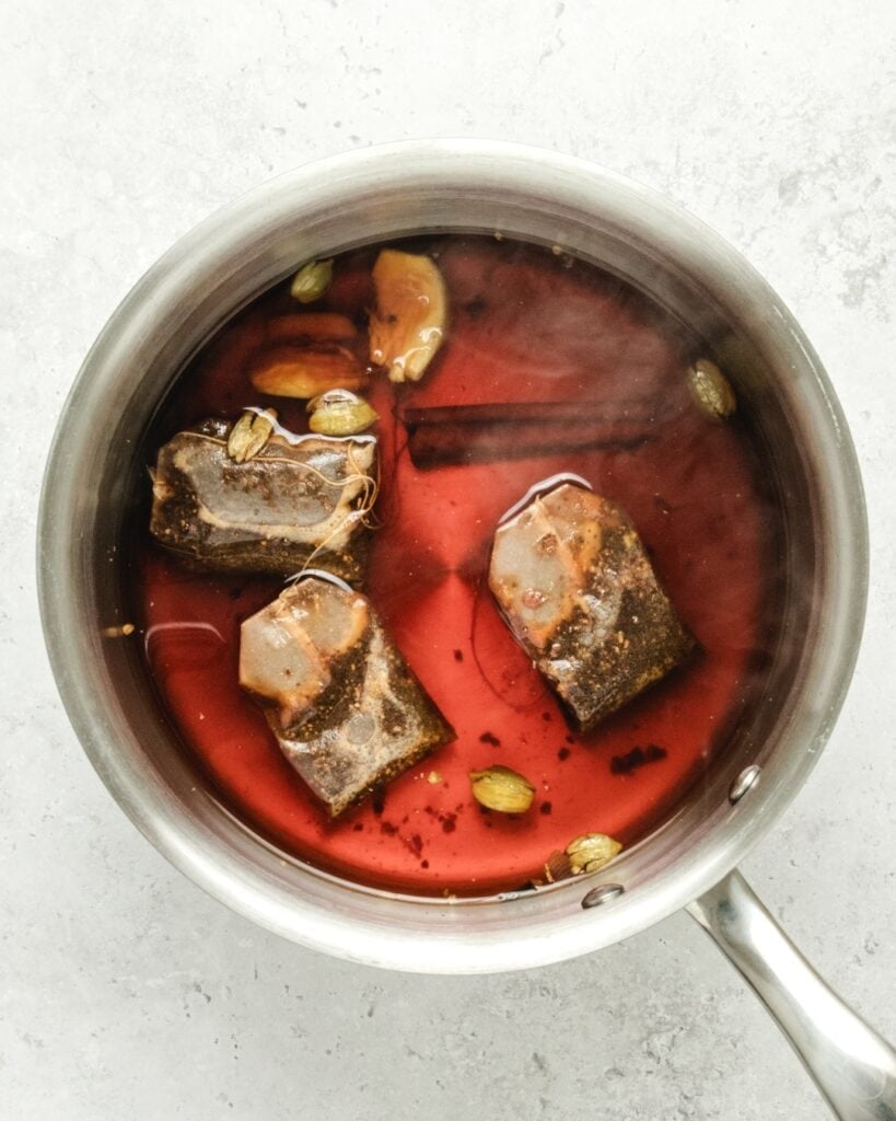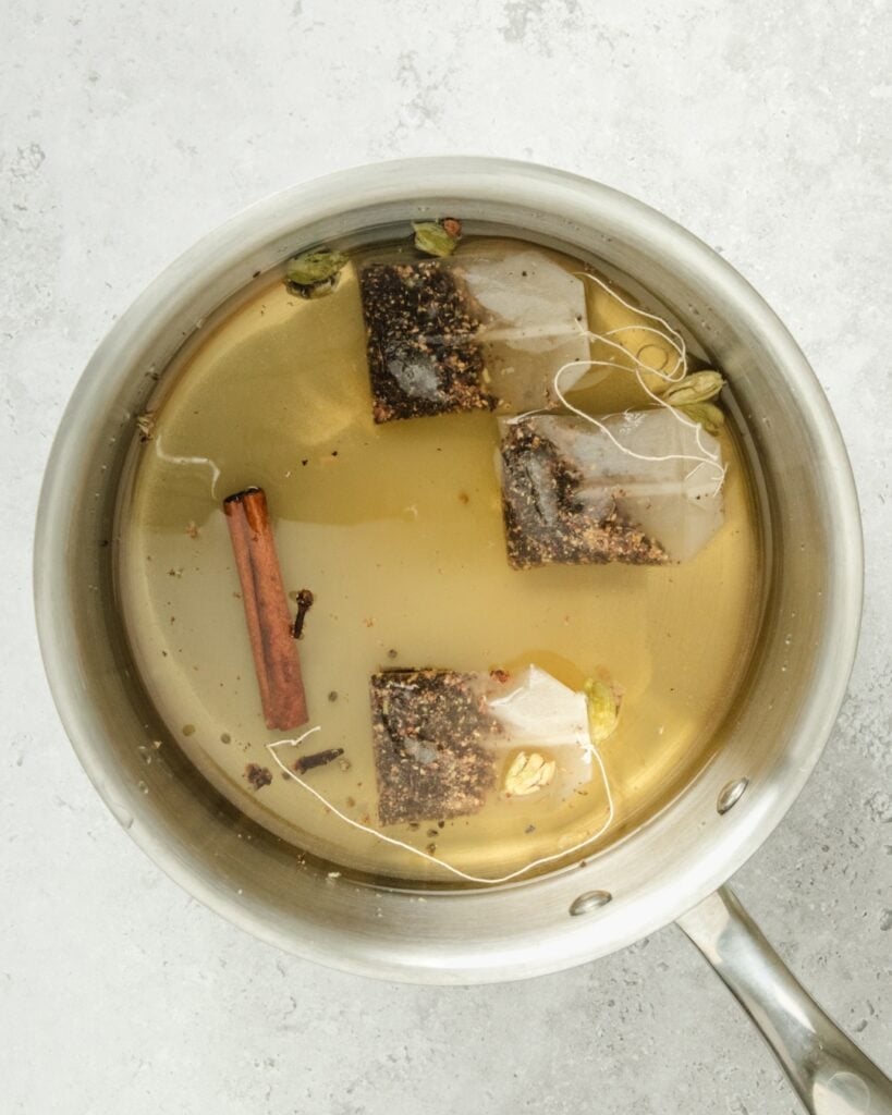 - Start with 2 cups of water and 3 black tea bags in a saucepan.