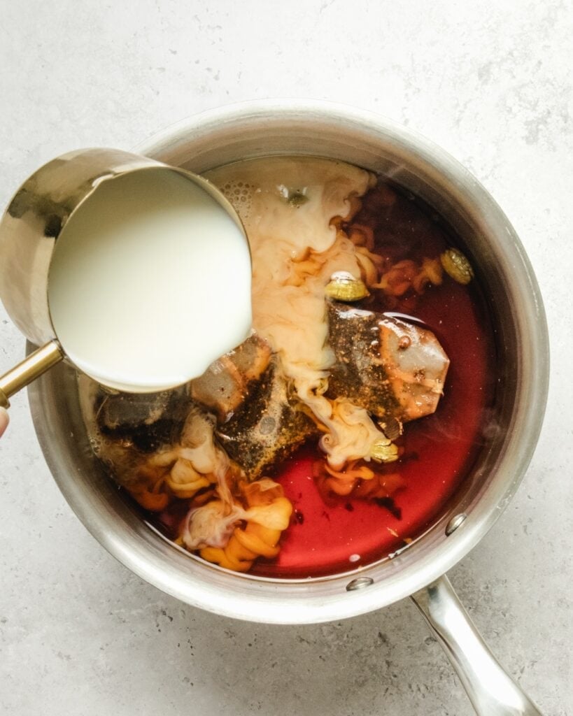- Slowly add the milk into the tea and raise the heat back up.